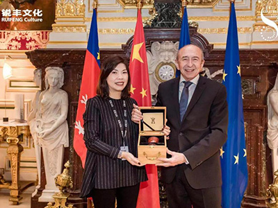▲里昂市長熱拉爾.科隆先生與廣州**燈光節(jié)總制作人、銳豐文化總經(jīng)理黃沛凌女士一行交談并互相贈送禮物。