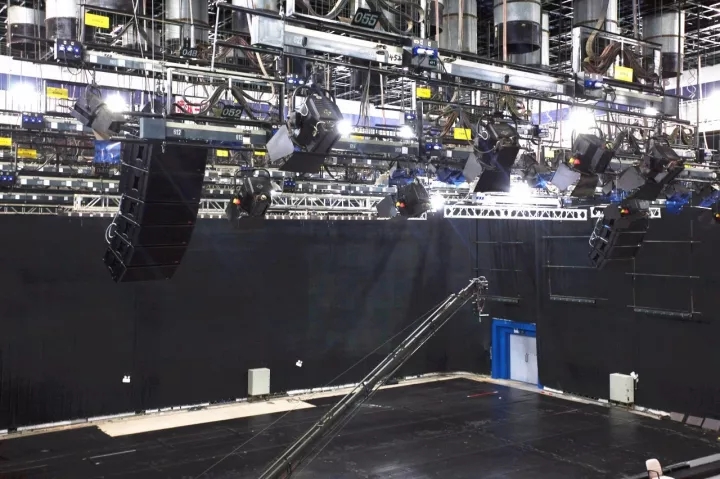 因為演播廳內(nèi)寬度比較大,所以用了三組音箱,可以均勻覆蓋全區(qū)域。整個演播廳采用了12只雙十寸全頻陣列揚聲器 、4只雙十二寸全頻陣列揚聲器、2只雙十八寸超低頻揚聲器。左右聲道采用4+2+1結(jié)構(gòu)組成四分頻系統(tǒng),極大的拓寬了頻響范圍,中間聲道主要補充100Hz以上的中高頻段的覆蓋均勻度和語音清晰度;通過EASE聲學(xué)模型模擬計算和現(xiàn)場Smaart 8準(zhǔn)確測量,使聲音準(zhǔn)確覆蓋觀眾席區(qū)域,避開兩側(cè)及后部墻面反射,有效降低擴聲對舞臺拾音的影響。