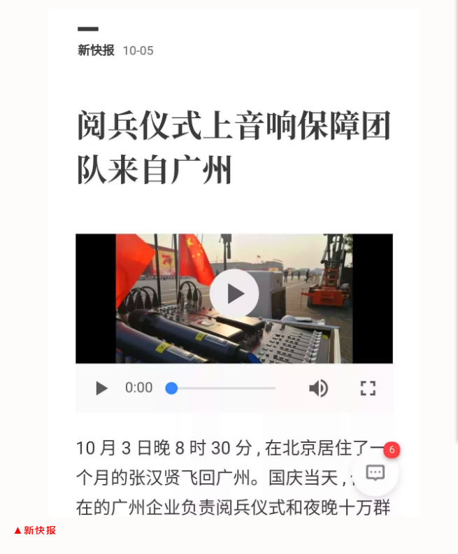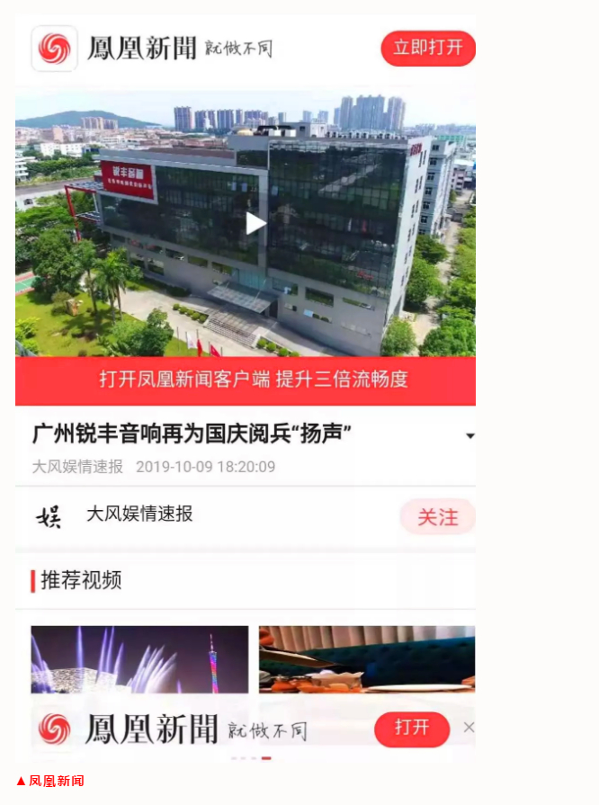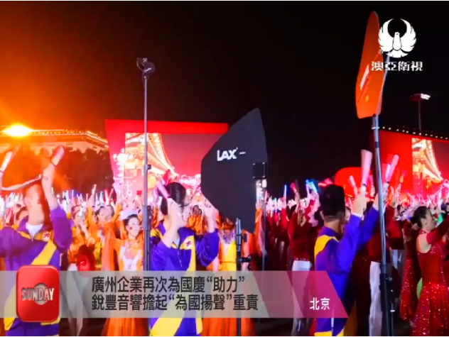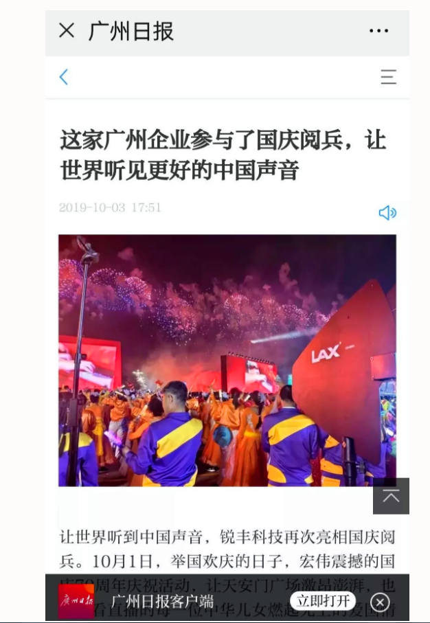 廣州廣播電視臺、G4出動、澳亞衛(wèi)視等電視臺,在各自的新聞頻道中紛紛報道銳豐科技股份參與國慶揚聲項目,贊揚廣州企業(yè)“為國揚聲”。