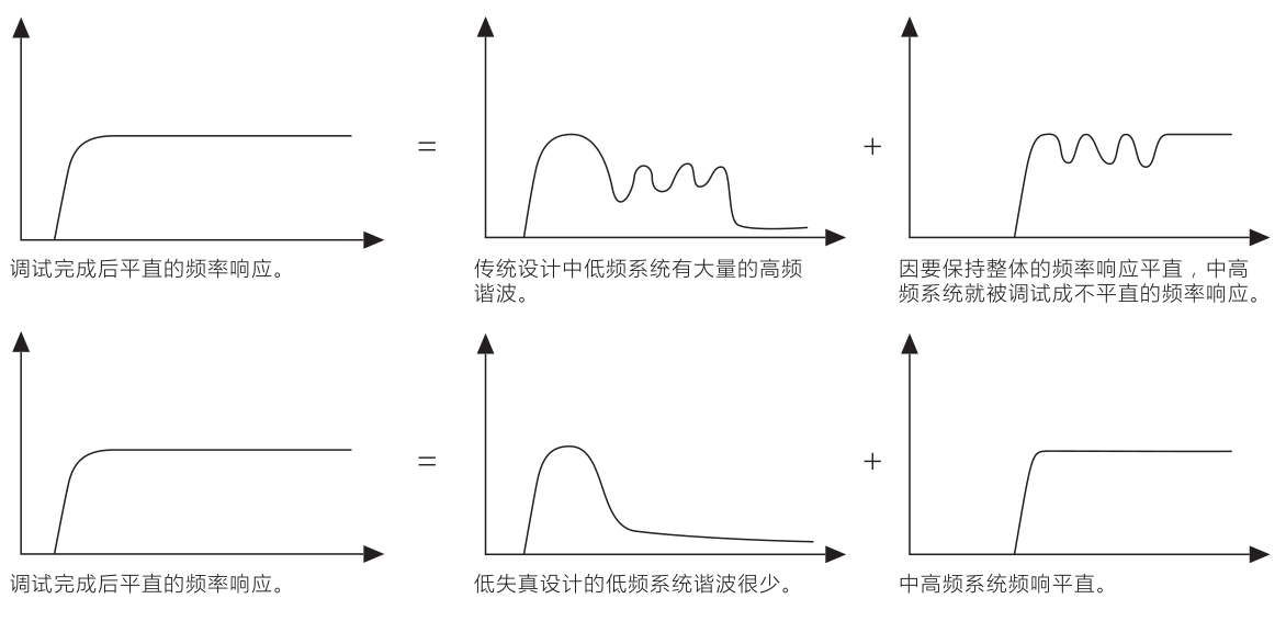- 根據(jù)“回縮倍頻程”理論,為保證更低的失真,揚(yáng)聲器系統(tǒng)理想的工作頻帶是其頻響范圍兩端再回縮一個(gè)倍頻程。也就是說(shuō),中頻系統(tǒng)如果分頻點(diǎn)為 2KHz,就必須擁有 4KHz 以上的頻響上限。而且傳統(tǒng)的中頻號(hào)角技術(shù),頻響上限一般只能到達(dá) 2KHz 左右,其理想工作頻率上限只能到達(dá) 1KHz 左右,如果仍然在 2KHz 分頻,勢(shì)必造成較大的失真。