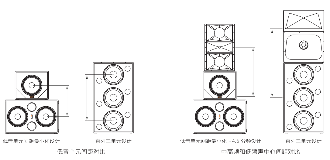 - LAX 在線性陣列音箱研發(fā)方面擁有豐富的經(jīng)驗(yàn)和技術(shù)積累,對(duì)避免多單元共同工作時(shí)的干涉有精辟的見(jiàn)解。LAX 在設(shè)計(jì) CH435 時(shí)發(fā)現(xiàn)傳統(tǒng)的直列 3 低音單元排列方式由于單元間間距過(guò)大,存在接近工作頻率上限時(shí)單元間互相干涉導(dǎo)致的偏軸位置的頻響不平直問(wèn)題。同時(shí)由于直列 3 低音單元排列布置方式的低頻組件聲中心和中高頻組件的聲中心距離較大,會(huì)造成還原出來(lái)的聲音聲像尺寸較大,影響音頻系統(tǒng)定位的準(zhǔn)確度。