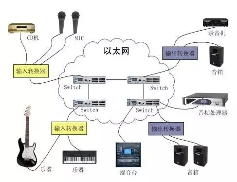 DANTE可以任由音頻信號在以太網(wǎng)中使用TCP/IP方式任意傳送,而且在這個過程中能保持信號的準確還原。下面的圖一反應了DANTE網(wǎng)絡的連接工作方式: