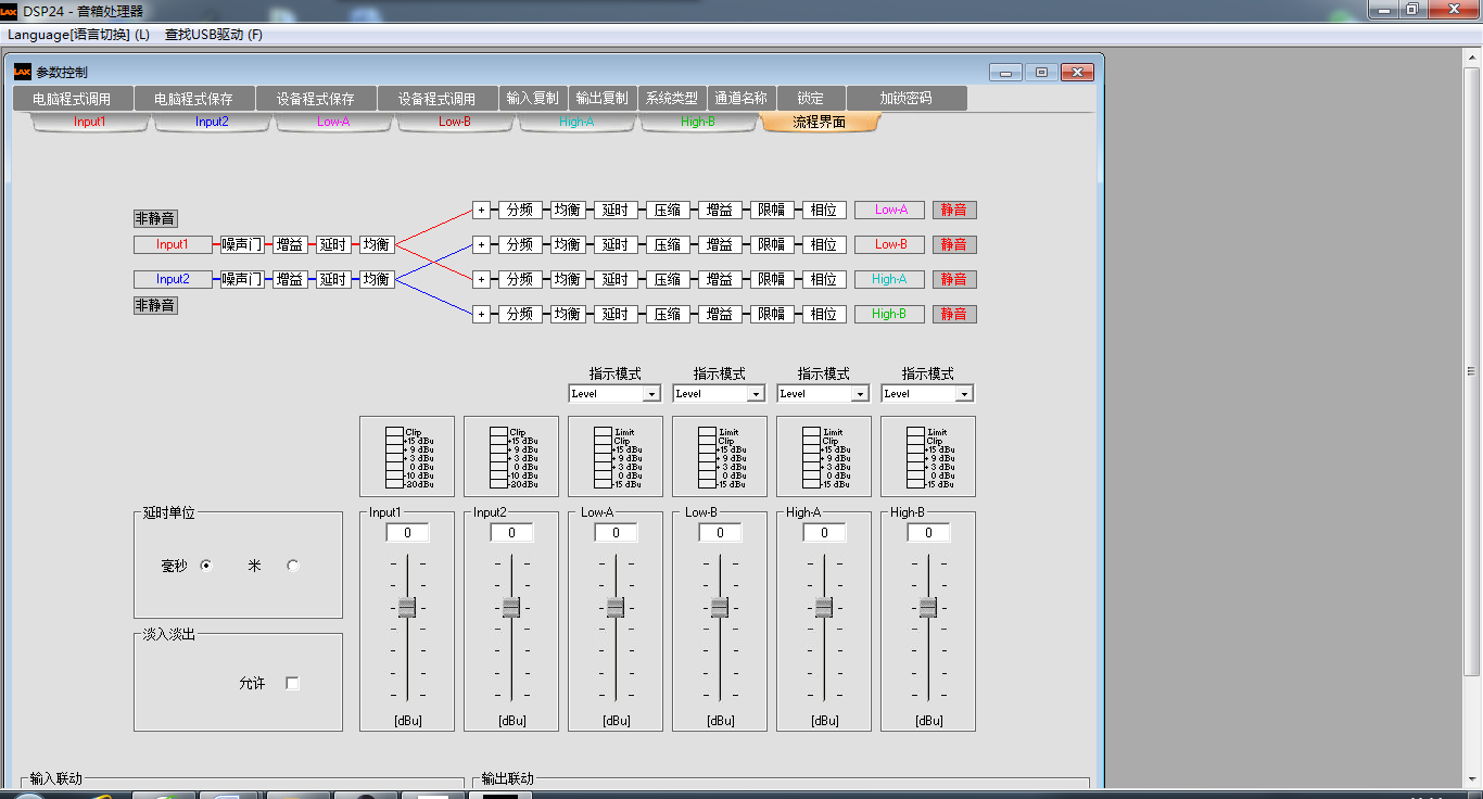 輸入通道功能包含電平增益控制、五段參量均衡、延時(shí)控制等;輸出通道功能包含分頻控制器、限幅控制器、輸出增益控制、相位控制、七段參量均衡、延時(shí)控制等,限幅器具有啟動(dòng)時(shí)間、釋放時(shí)間等功能。輸出通道具有通道鏈接功能,通過鏈接后可同時(shí)編輯同類型的輸出通道。