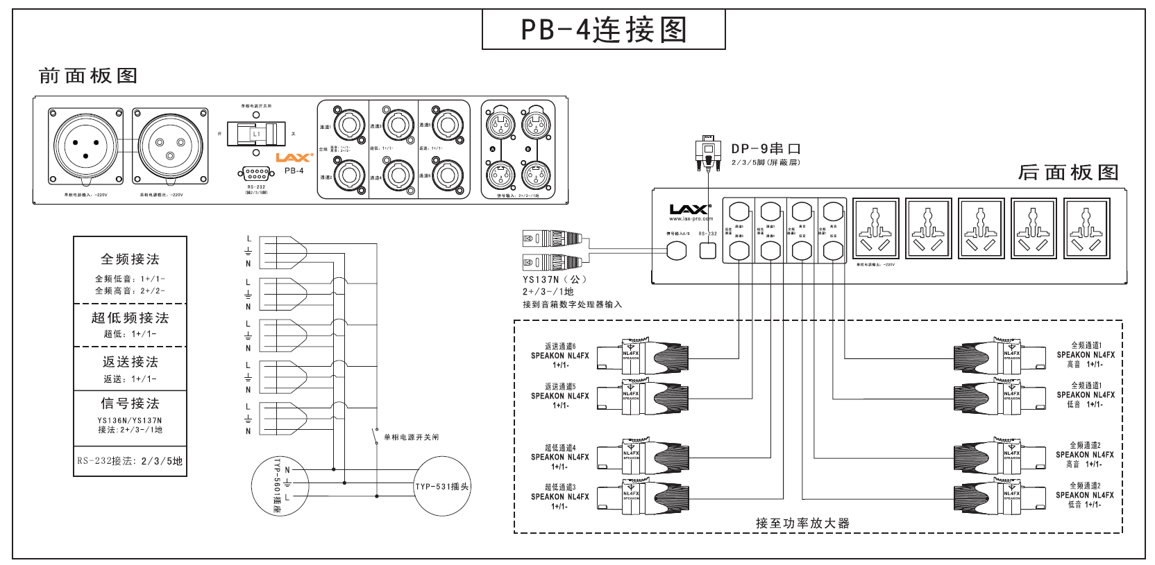 配備單相220V防水電源輸入/輸出插口,可為相鄰功放機柜提供級聯(lián)供電;
