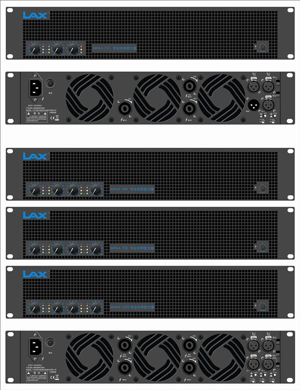 | MPA4-900 | 8Ω立體聲功率:900W*4; 4Ω立體聲功率:1350W*4; 8Ω橋接單聲道功率:2700W*2; 頻率范圍(1W@8Ω):20Hz-20kHz(0/-1dB); 總諧波失真:<0.1%; 阻尼系數(10Hz-400Hz):>250; 信噪比:>100dB; 輸入靈敏度:0.775V or 1.4V 轉換速率:>20V/us; 尺寸88*483*426mm; 凈重:21Kg |