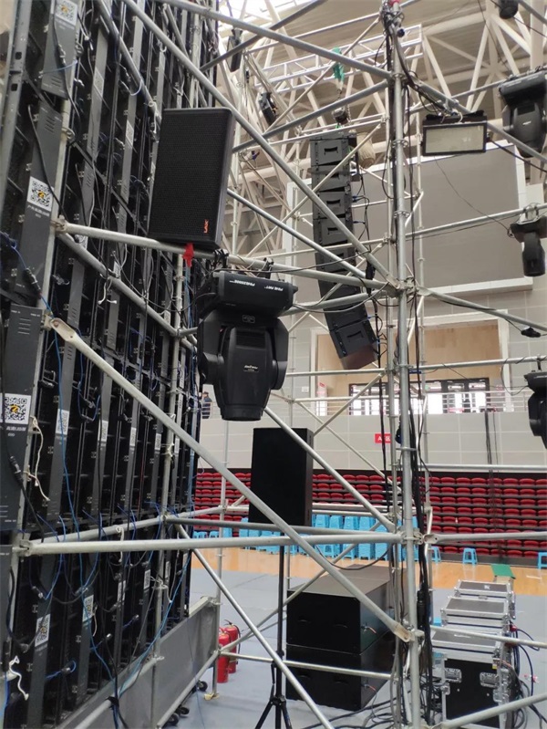 其次,橫跨超過30米的舞臺,而且要求整個舞臺都有返送聲音的覆蓋,同時揚聲器必須隱藏放置,這也是一個難題,綜合考慮之下,吊掛返送揚聲器便是一個比較合理的方案,采用了兩側(cè)隱藏吊裝返送揚聲器的方式來覆蓋整個舞臺,同時加兩只側(cè)返送揚聲器用于補充盲區(qū),使得整個舞臺聲音清晰,聲場均勻,也因為吊掛位置足夠高,大大抑制了嘯叫產(chǎn)生的可能性,很好的解決了這個舞臺返送的問題。