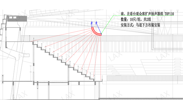 采用LAX TOP110兩分頻兩驅(qū)動單10寸線陣列揚(yáng)聲器,南北長看臺每組10只,共2組;