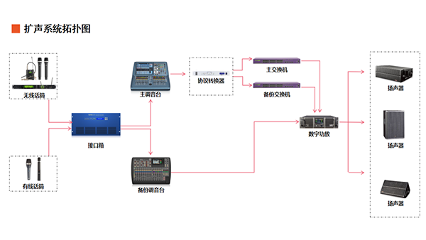 傳輸采用模擬+DANTE網(wǎng)絡(luò)的方式。會議用話筒等設(shè)備通過接入網(wǎng)絡(luò)音頻處理器,